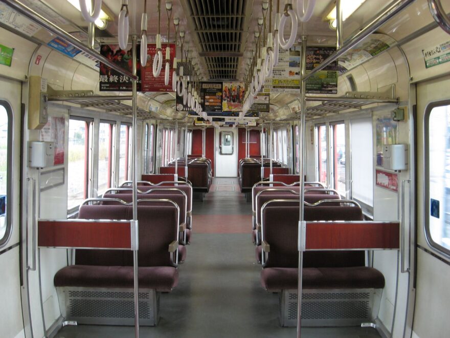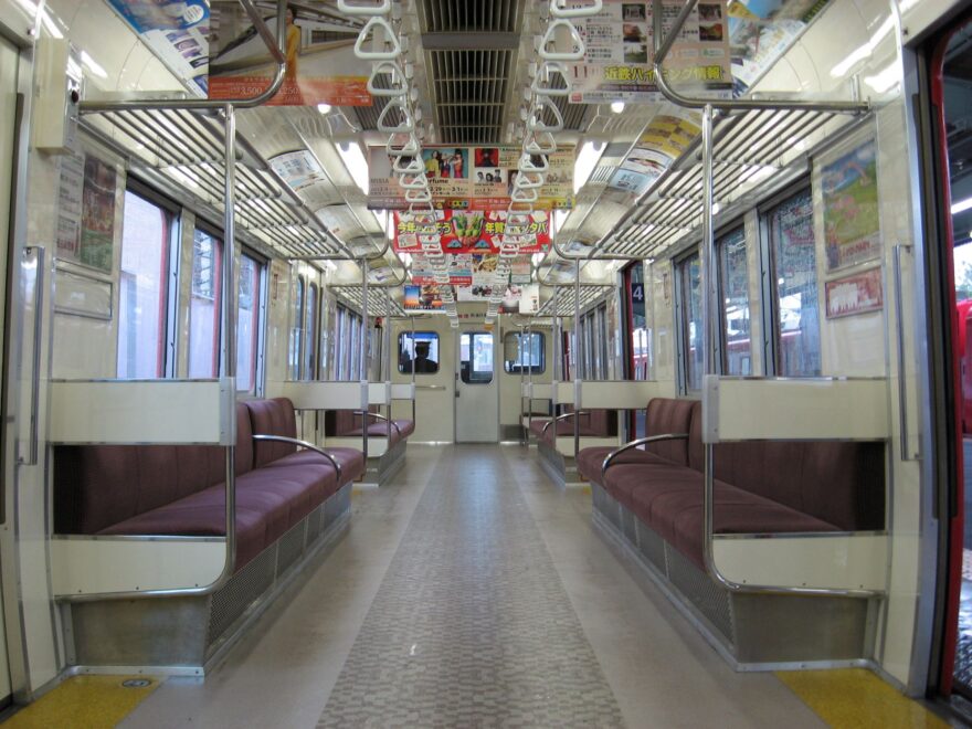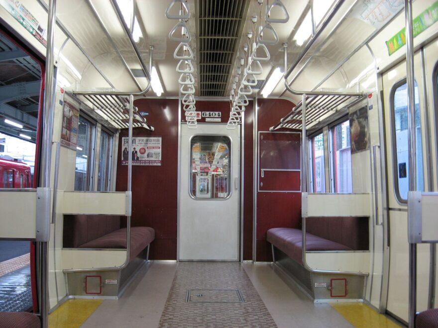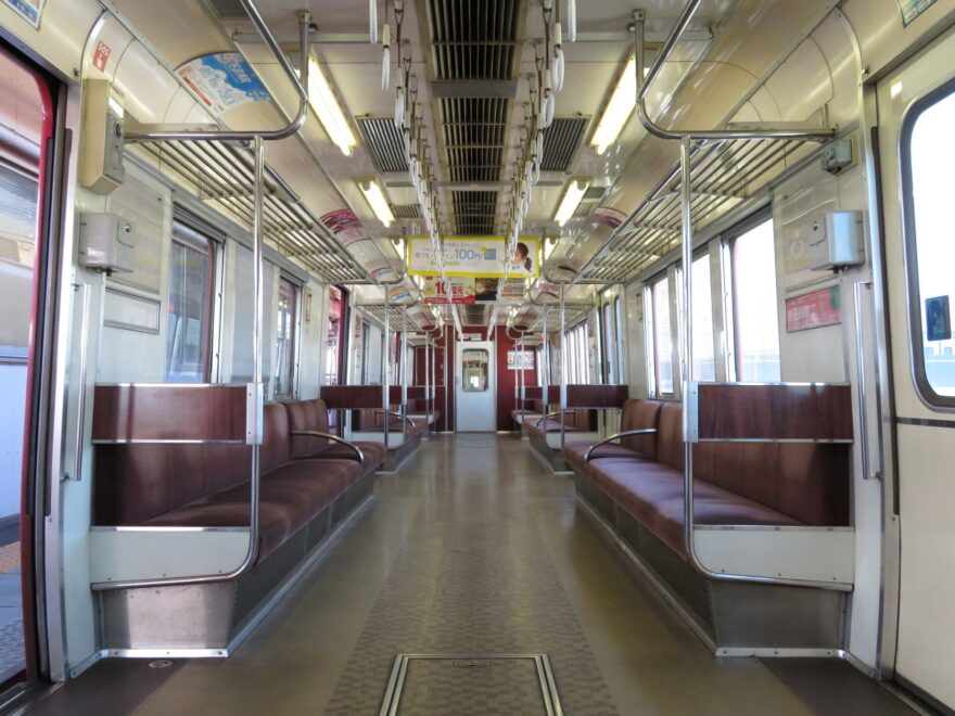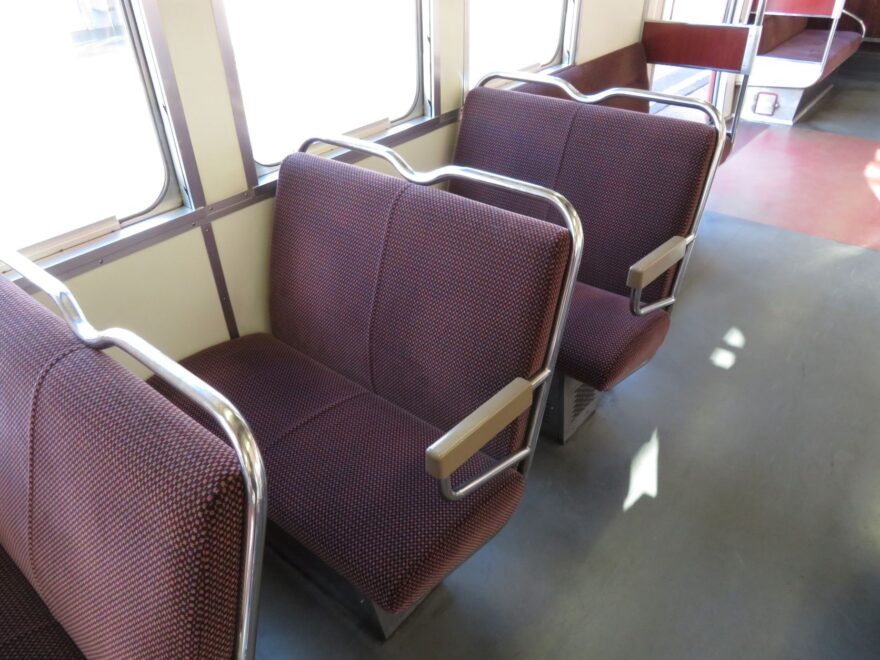 セミクロスシート時代にあったロングシートの金属の仕切りがそのまま残されているのが特徴です。現在よく見かけるロングシートのポールの先駆けとも言えるかもしれません。