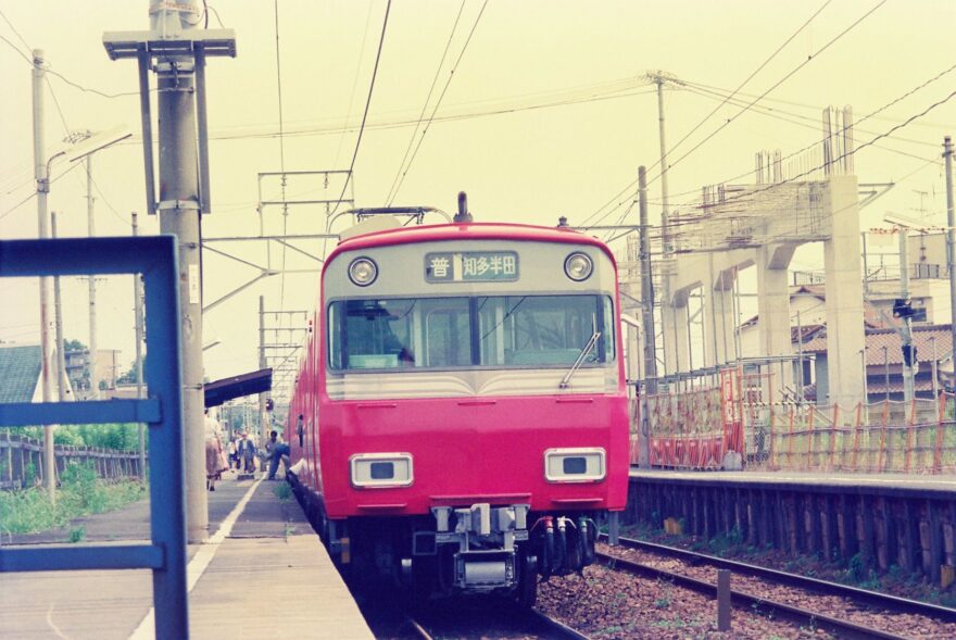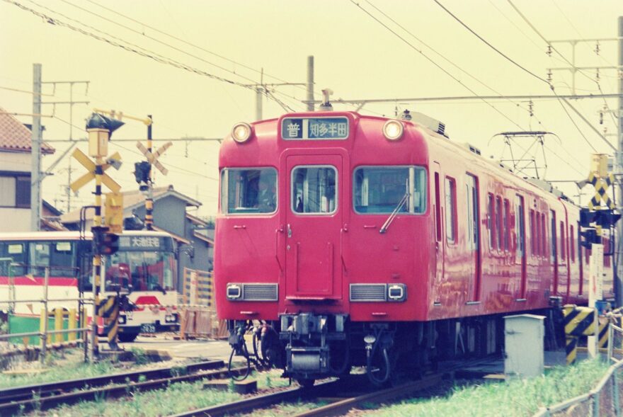 踏切(高横須賀1号踏切)で待つバスは、名鉄バス(当時は名古屋鉄道のバス部門)の大池住宅行きで、現在は廃止されてしまいました。