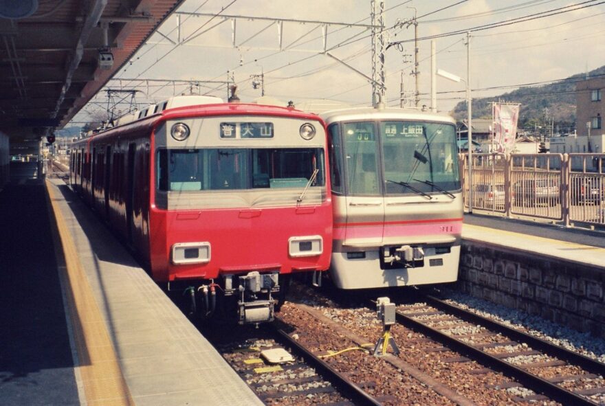 楽田駅での6800系同士の並び(2003年3月撮影)。