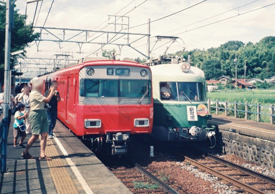 今回の最後に、現在では見られない6000系列と他の形式との並びをご覧ください。3400系「いもむし」と6500系鉄仮面との並び(2002年8月、善師野にて撮影)。
