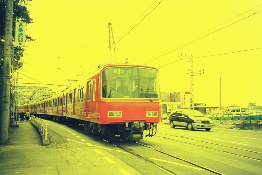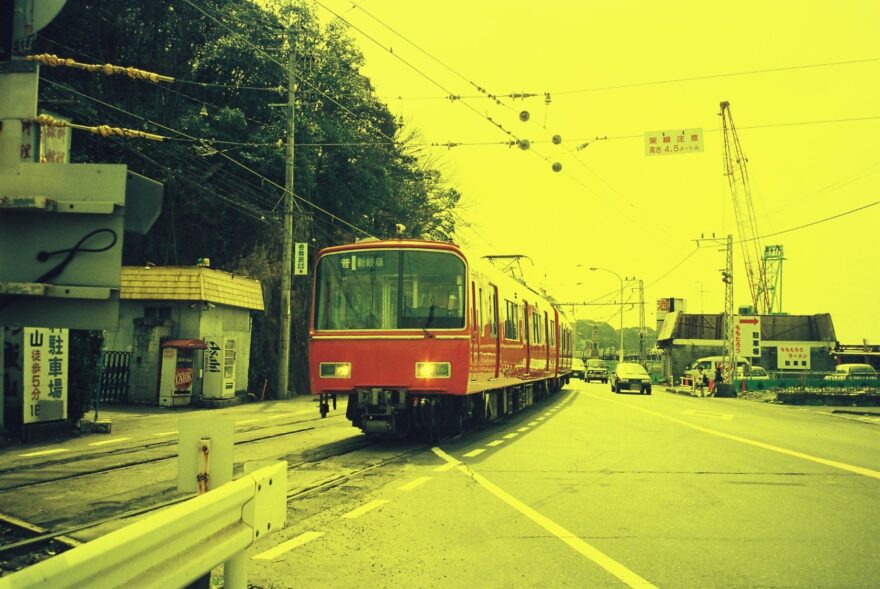 次も現在は高架になったところの写真をご覧ください。高架化前の高横須賀駅に止まる鉄仮面(1998年7月撮影)。