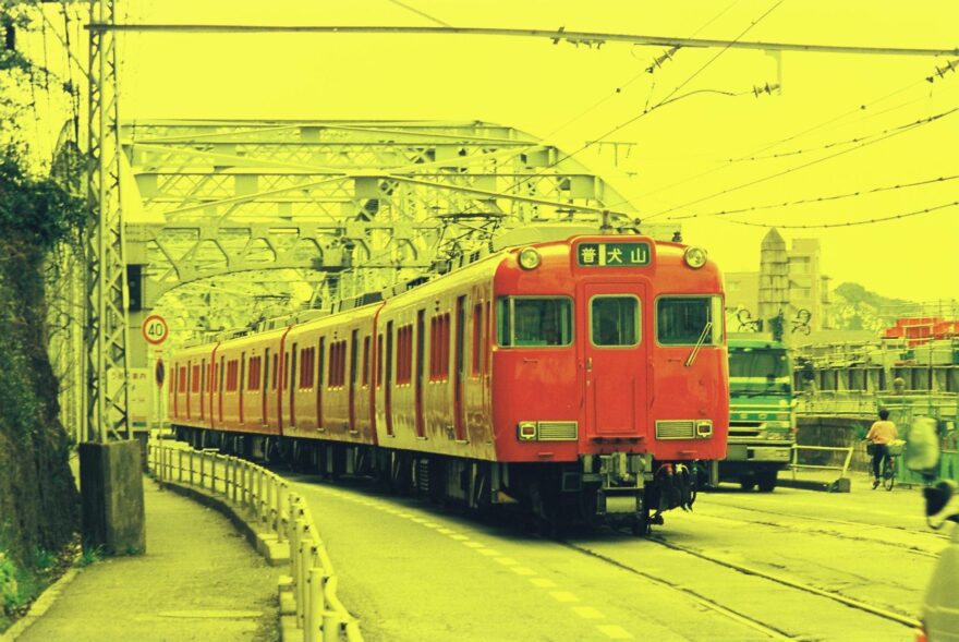 ここからは、現在は鉄道専用橋になった犬山橋周辺での写真をご覧ください。新鵜沼駅に入線する6800系(1999年4月撮影)。